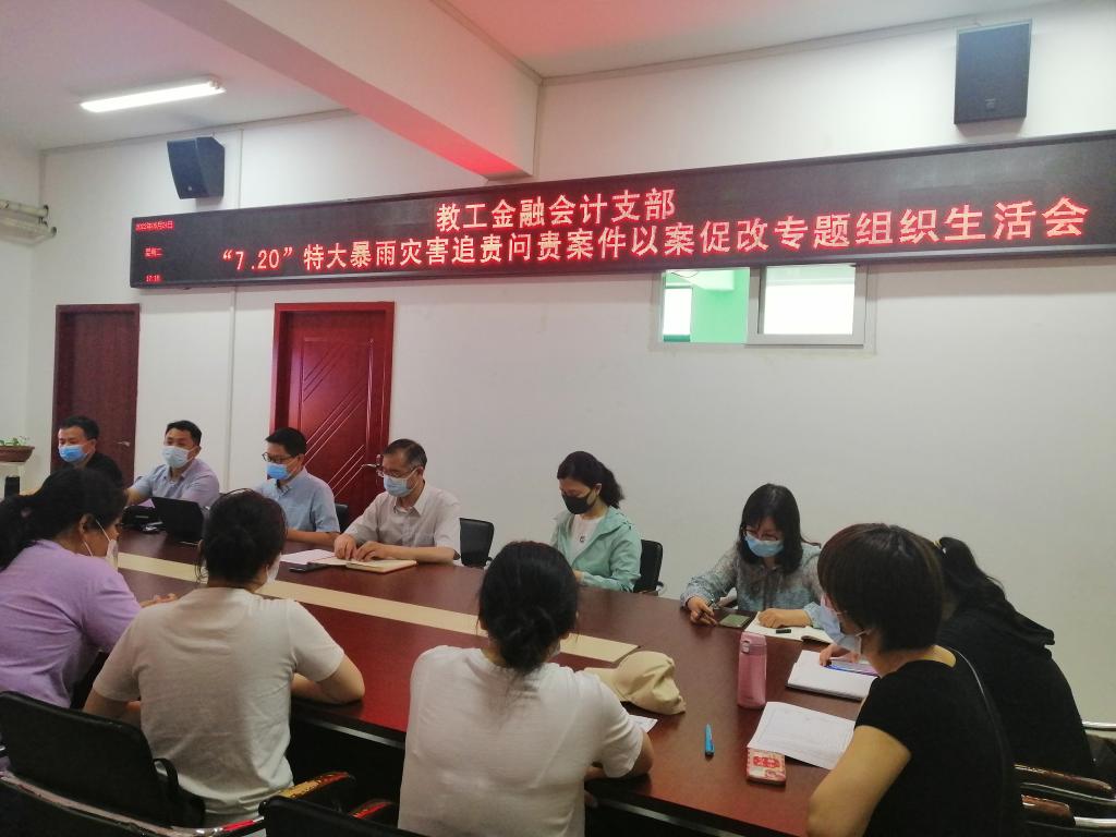 5月24日下午,教工金融会计党支部在SY5412会议室召开了郑州“7.20”特大暴雨灾害追责问责案件以案促改专题组织生活会,全体教工党员参加。会议由教工支部书记刘振威主持。