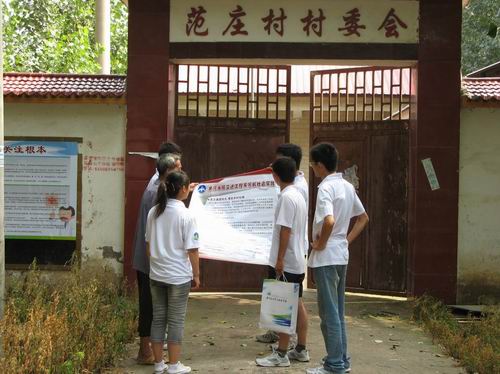 在范庄村,社会实践活动小分队首先在村支书马九民的带领下,前往村委会粘贴了农村社会保障制度的宣传展板,并现场发放了宣传资料,以帮助村民们更好的了解国家的惠民政策。