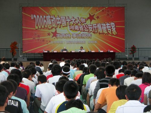 5月19日下午3点,由院团委、水利系共同组织的“2006年感动中国十大人物之一”王百姓事迹报告会在风雨球场举行。副院长刘紫婷、院团委书记周志琦、副书记谷献晖、水利系党总支部书记来卫东、主任刘纯义、副书记薛建荣、副主任罗全胜参加了报告会。