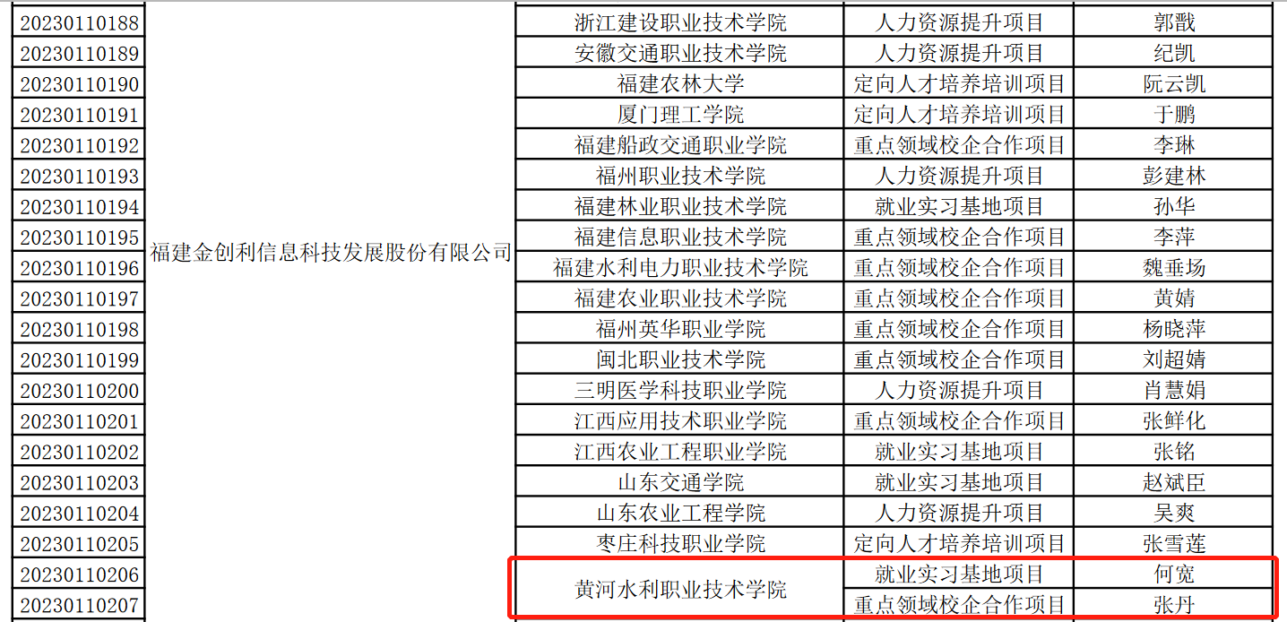 近日,教育部高校学生司正式发布了《关于公布第二期供需对接就业育人项目立项名单的通知》,我院共获批4项就业育人项目立项。其中,与福建金创利信息科技发展股份有限公司合作的科技服务行业供需对接项目2项,分别为副院长何宽主持的“威尼斯432888cam与福建金创利信息科技发展股份有限公司就业实习基地项目”和副院长张丹主持的“威尼斯432888cam与福建金创利信息科技发展股份有限公司重点领域校企合作项目”;另外,学院招生就业办公室主任李洪超主持的“与上海华测导航技术有限公司就业实习基地”装备制造业供需对接项目、陈琳教授主持的“与航天宏图信息技术股份有限公司就业实习基地”信息通讯与互联网行业供需对接项目亦同批获得立项。4个项目成功立项,标志着我院深入开展校企合作和产教融合的人才培养思路获得教育部的认可。