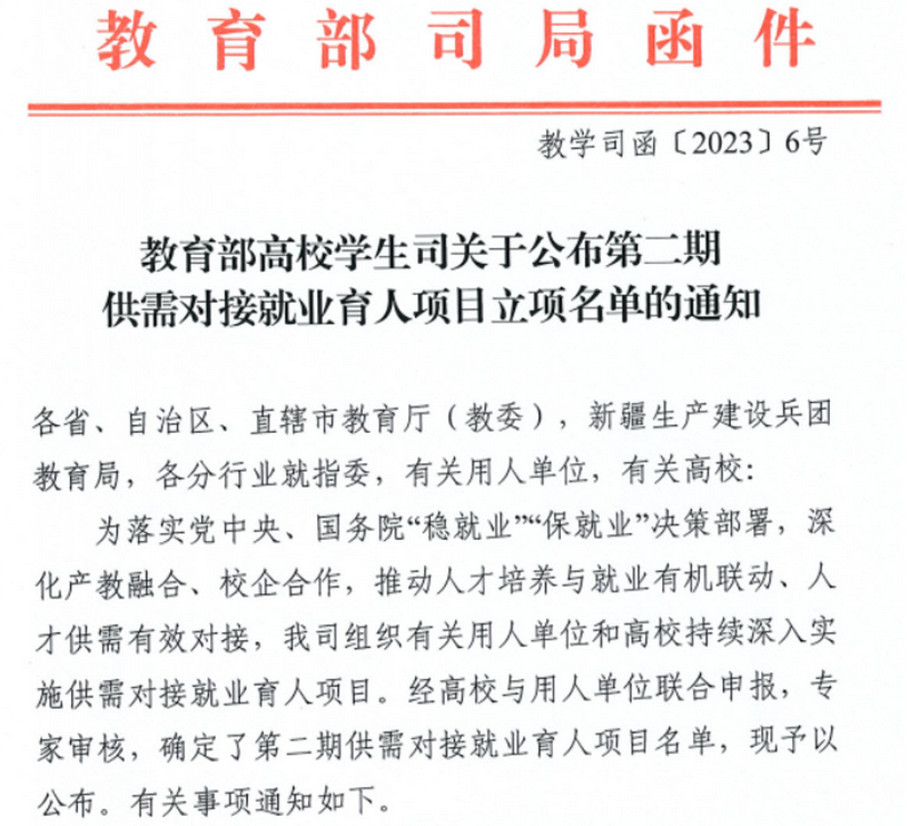 据悉,教育部供需对接就业育人项目是为深入贯彻《“十四五”教育发展规划》、《国务院办公厅关于深化产教融合的若干意见》,落实党中央、国务院“稳就业”“保就业”决策部署,深化产教融合、校企合作,推动人才培养与就业有机联动、人才供需有效对接,由教育部高校学生司组织有关用人单位和高校实施的就业育人项目。