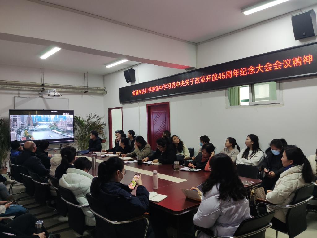 12月26日下午,金融与会计学院在SY5412会议室组织召开学习党中央改革开放45周年纪念大会会议精神专题学习会。全体教职工参加,会议由党总支书记胡晓慧主持。