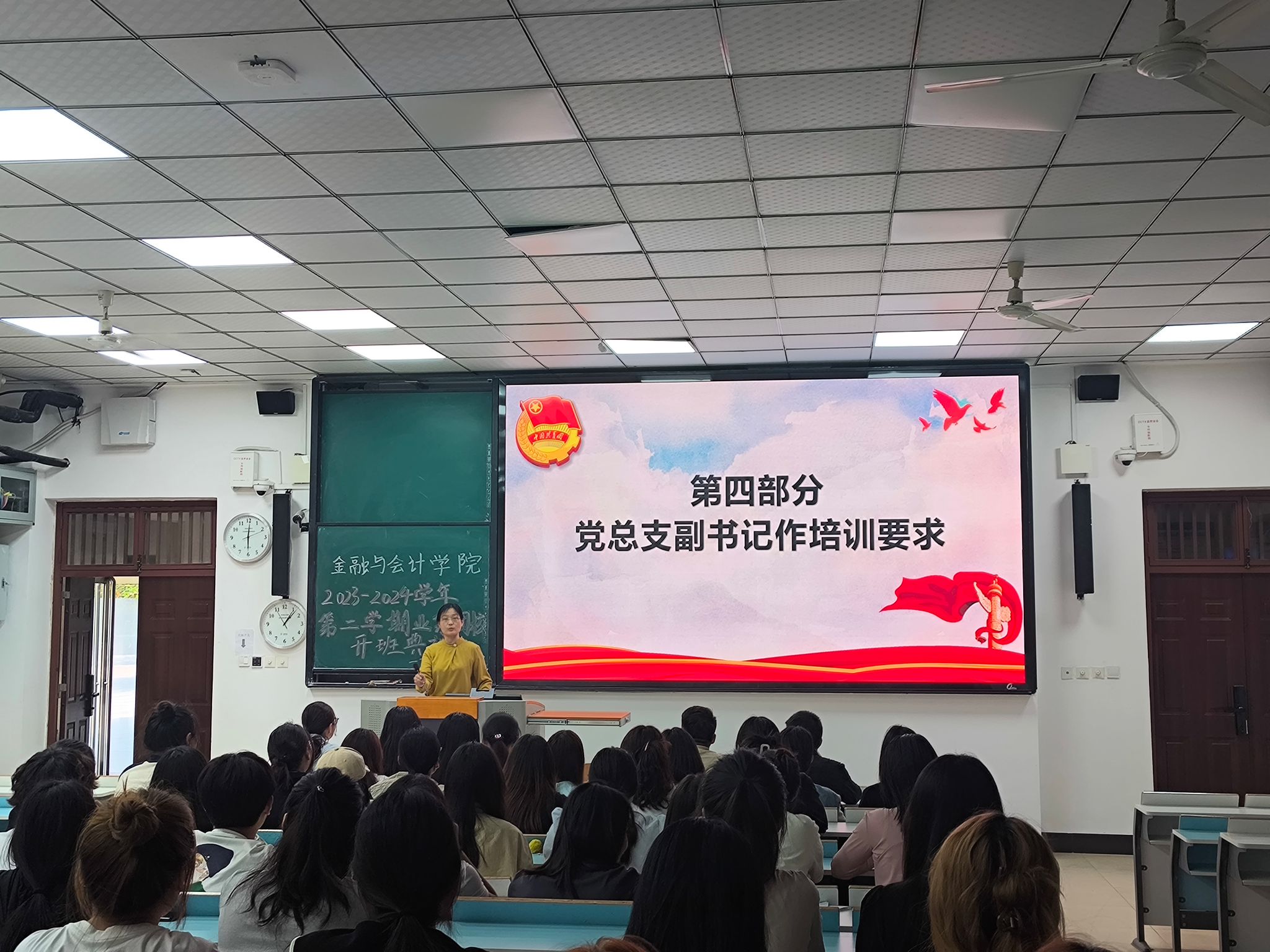 4月27日中午,金融与会计学院在JX6103教室举行2023-2024学年第二学期业余团校开班典礼,院党总支副书记霍卫红、分团委书记马峥、各年级辅导员与团校学员出席会议。典礼由分团委组织部学生干部魏家烁主持。