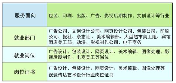 本专业面向包装、印刷、出版、广告等行业、企业生产第一线,培养德、智、体、美全面发展,掌握必备的专业理论知识,具备广告设计、包装设计、网页设计、美术编辑、图像处理、影视后期制作的能力,能够胜任广告设计、包装设计、网页设计、美术编辑、图像处理、影视后期制作等岗位工作,具有良好职业道德和较强法律意识的高技能人才。